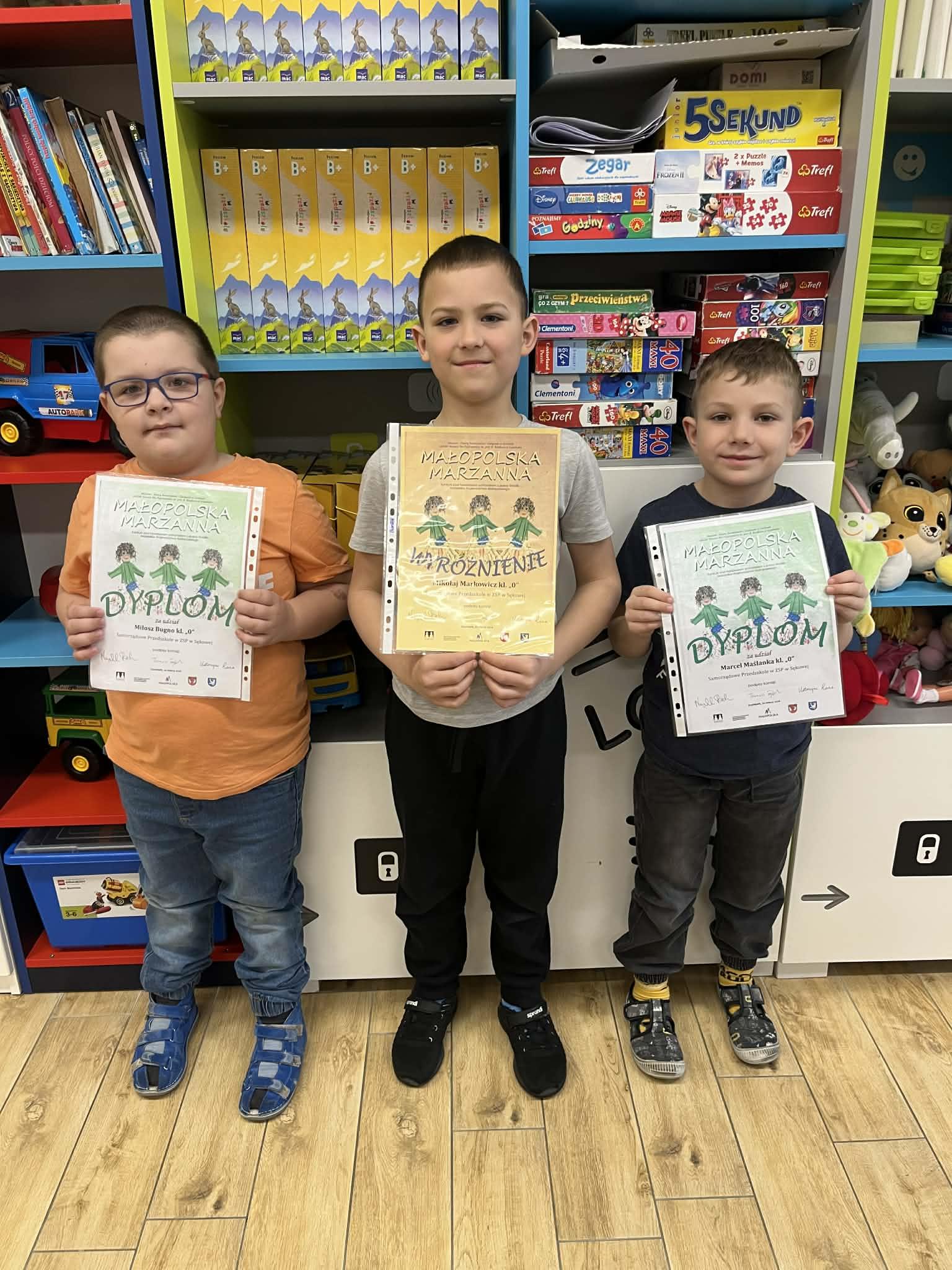 Dnia 20.03.2026r. w Skansenie Wsi Pogórzańskiej im. Prof. Romana Reinfussa w Szymbarku odbyło się uroczyste rozstrzygnięcie konkursu „Małopolska Marzanna 2026” pod honorowym patronatem Łukasza Smółki – Marszałka Województwa Małopolskiego. Koordynatorem konkursu była P. Barbara Prokop. W konkursie wzięło udział troje dzieci z grupy „Sówki” (kl. „0”) tj. Mikołaj Markowicz, który otrzymał wyróżnienie, Marcel Maślanka i Miłosz Bugno, którzy otrzymali dyplomy za udział. Dzieci wraz z rodzicami z wielkim zaangażowaniem włączyły się do udziału w konkursie. Wydarzenie to pozostanie na długo w pamięci, a rodzicom dziękujemy za współpracę i zaangażowanie.