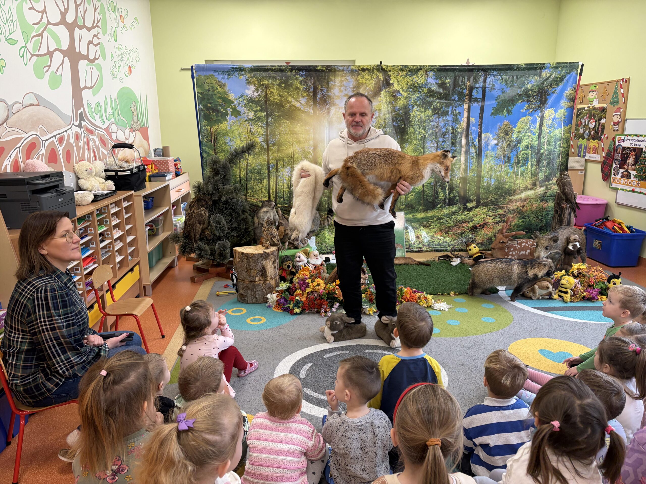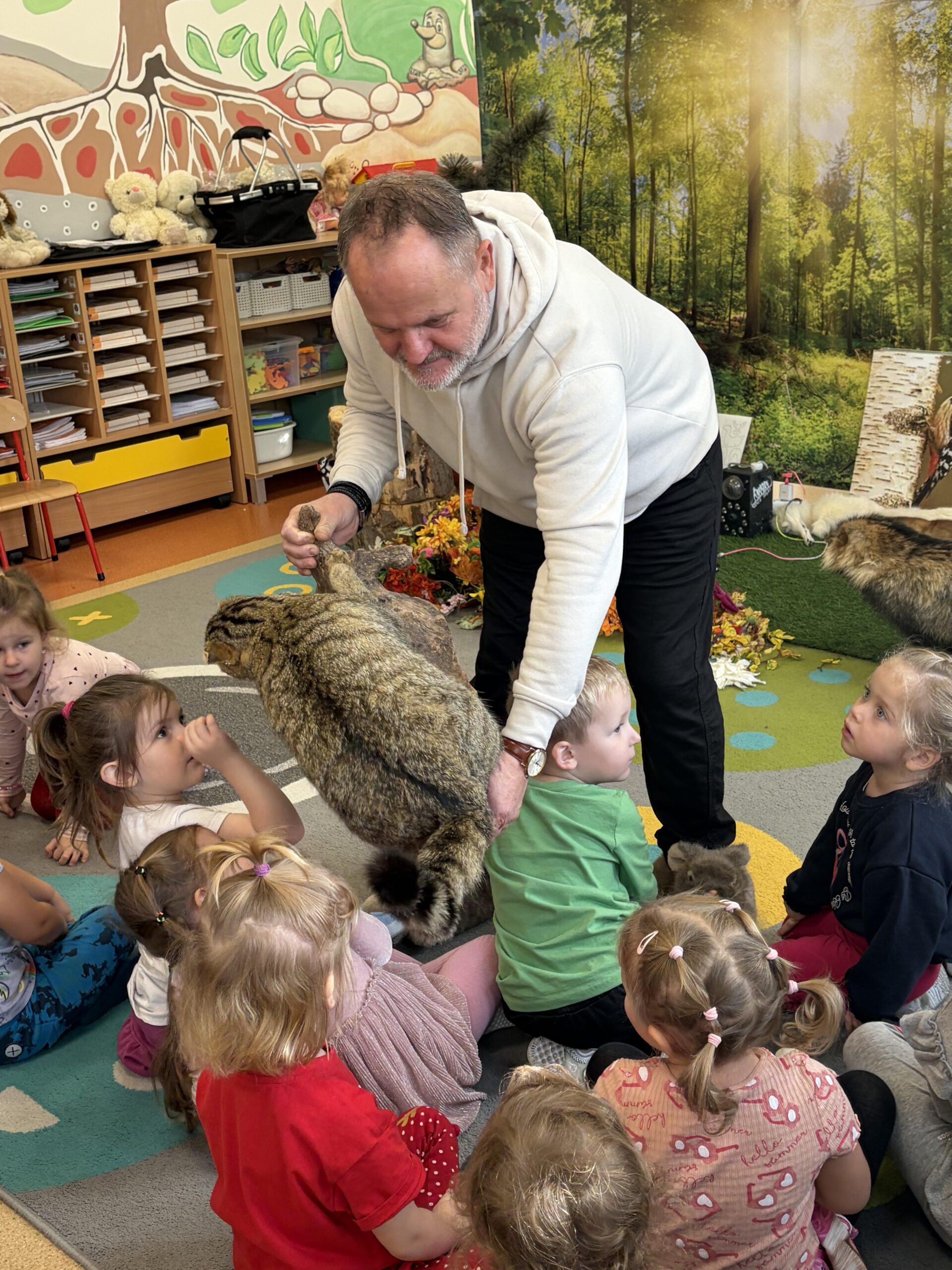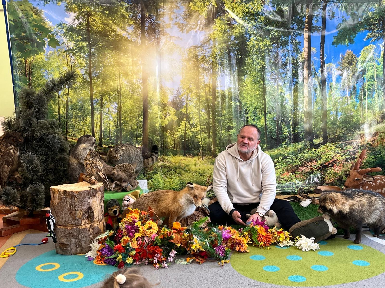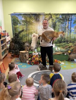 Podczas zajęć przybliżył przedszkolakom fascynujący świat leśnej przyrody. Dzieci miały okazję posłuchać oraz rozpoznawać śpiew wybranych gatunków ptaków, które od wczesnych godzin porannych budzą las swoim śpiewem. Poznały także zwyczaje niektórych zwierząt leśnych oraz mogły z bliska obejrzeć i dotknąć eksponaty przedstawiające m.in. lisa, dzika, łasicę oraz myszołowa.